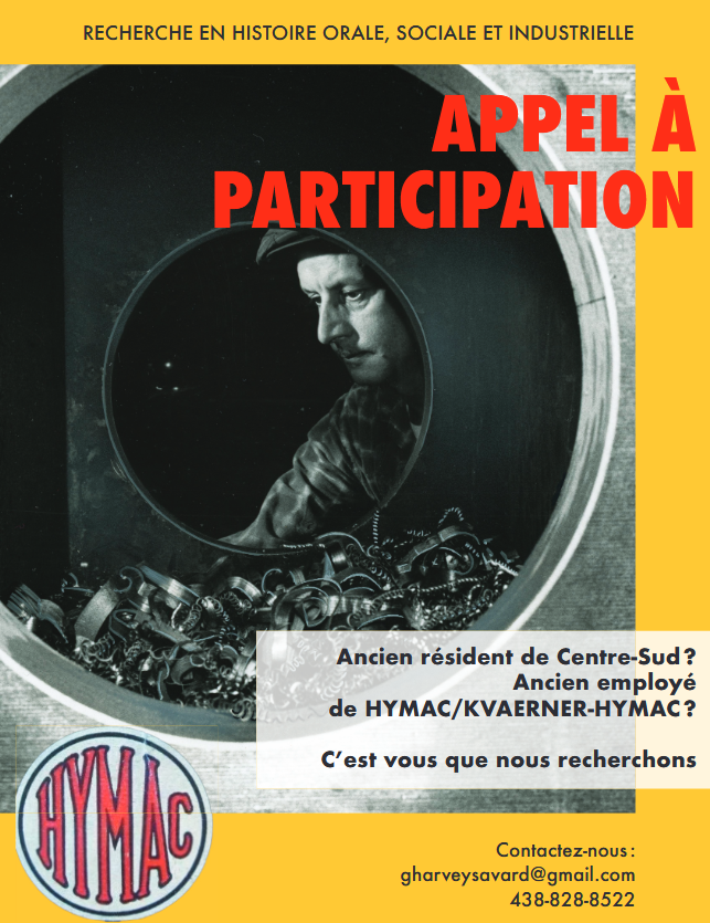 The Hymac Project lance un appel de candidatures dans le cadre d’une recherche en histoire orale, sociale et industrielle. Le projet consiste à produire un livre documenté et illustré en partie grâce au fonds d’archives dédié à la compagnie Hymac détenu par l’Écomusée du Fier Monde. L’appel vise à rechercher d’anciens résidents du quartier Centre-Sud et d’anciens employés de Hymac afin de documenter l’histoire technique et administrative de la compagnie sur près de 100 ans.