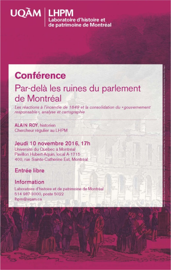 Le jeudi 10 novembre 2016, Alain Roy, membre du Laboratoire d’histoire et de patrimoine de Montréal, a présenté une conférence portant sur l’analyse et la cartographique des réactions politiques suite à l’incendie du parlement de Montréal de 1849. La conférence était en lien avec la parution de l’article d’Alain Roy dans le volume 70 de la Revue d’histoire de l’Amérique française, « La réponse à l’incendie du parlement de Montréal en 1849 ». Cette première conférence du cycle d’activités de l’automne du Laboratoire a permis à l’historien de présenter des résultats de recherche inédits ainsi que l’intégration du numérique dans son étude, via la cartographie. Elle a également été l’occasion de présenter la plateforme SCHEMA, (Système de Cartographie de l’HistoirE de MontréAl), projet d’infrastructure de données historiques géospatialisées du Partenariat de recherche Montréal, plaque tournante des échanges, au grand public.